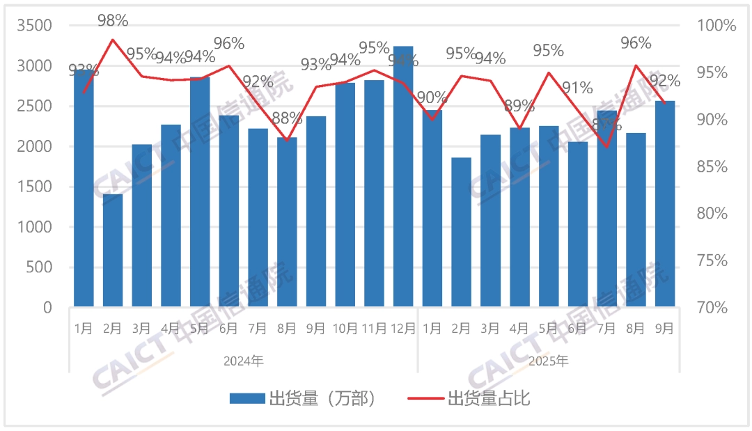 IT之家 11 月 20 日消息,中国信通院发布 2025 年 9 月国内手机市场运行分析报告,报告显示,2025 年 9 月,国内市场手机出货量 2793.1 万部,其中 5G 手机占比 86.3%。