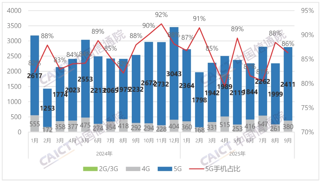 2025 年 9 月,国内市场手机出货量 2793.1 万部,同比增长 10.1%,其中,5G 手机 2410.6 万部,同比增长 8.0%,占同期手机出货量的 86.3%。