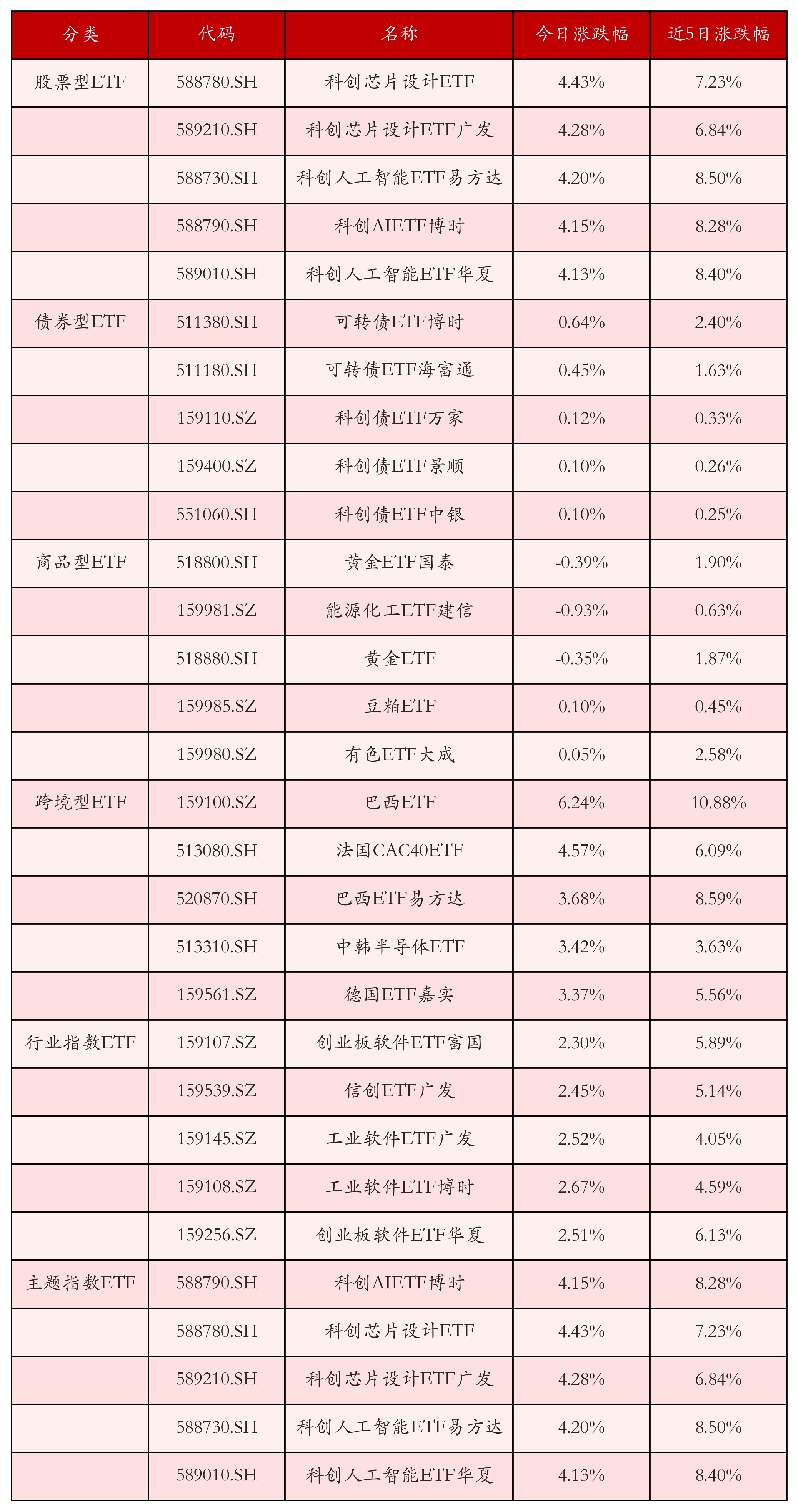 从不同投资种类、行业、主题的ETF产品中找出今日走势行情排名前5的ETF基金,今日涨幅靠前的ETF产品如下表所示。股票型ETF中涨跌幅排名前3位的ETF产品分别为科创芯片设计ETF(588780.SH)、科创芯片设计ETF广发(589210.SH)和科创人工智能ETF易方达(588730.SH),今日收益率分别为4.43%、4.28%和4.20%。
