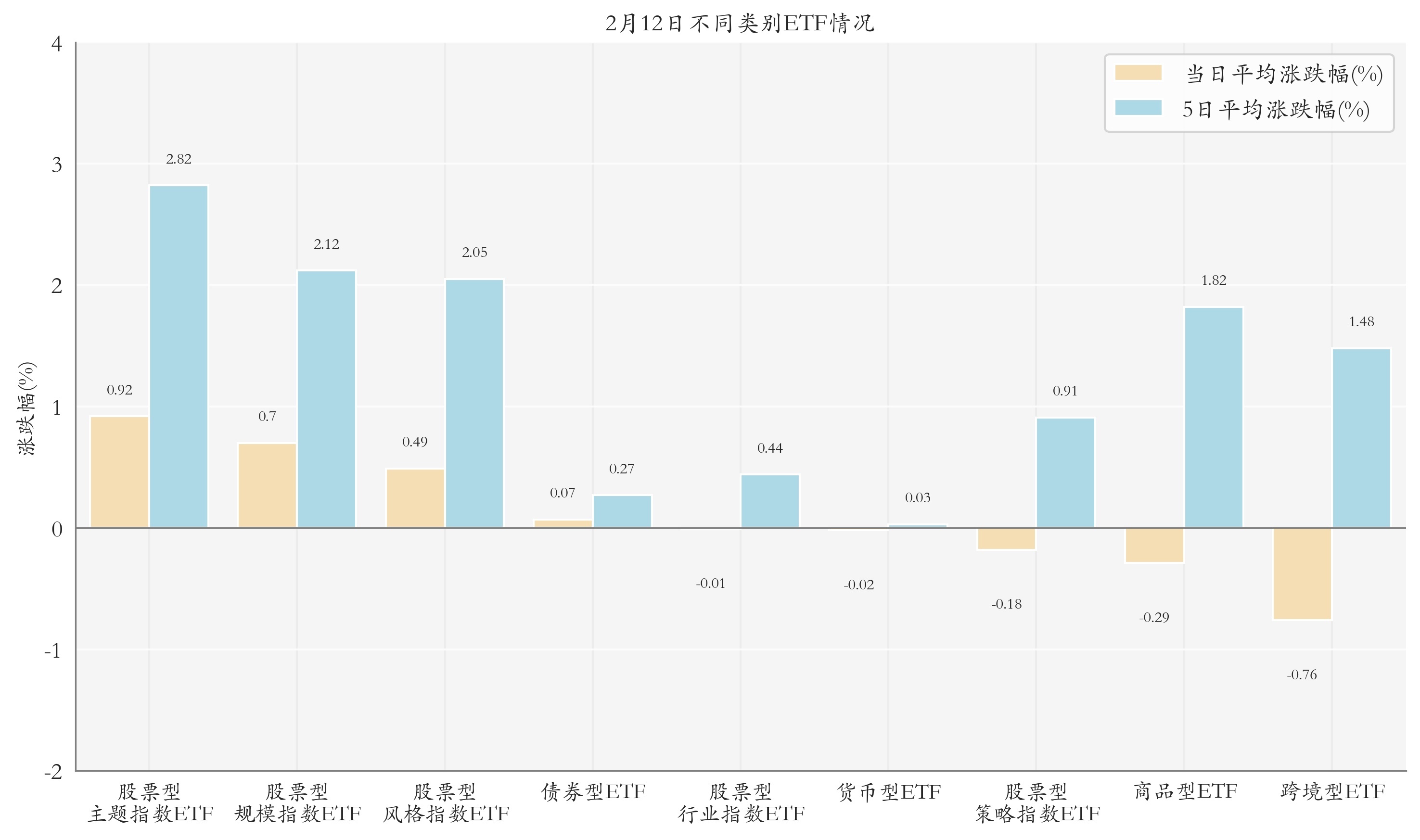 根据ETF基金的规模和涨跌幅计算得出不同分类情况下各类ETF基金的平均涨跌幅。