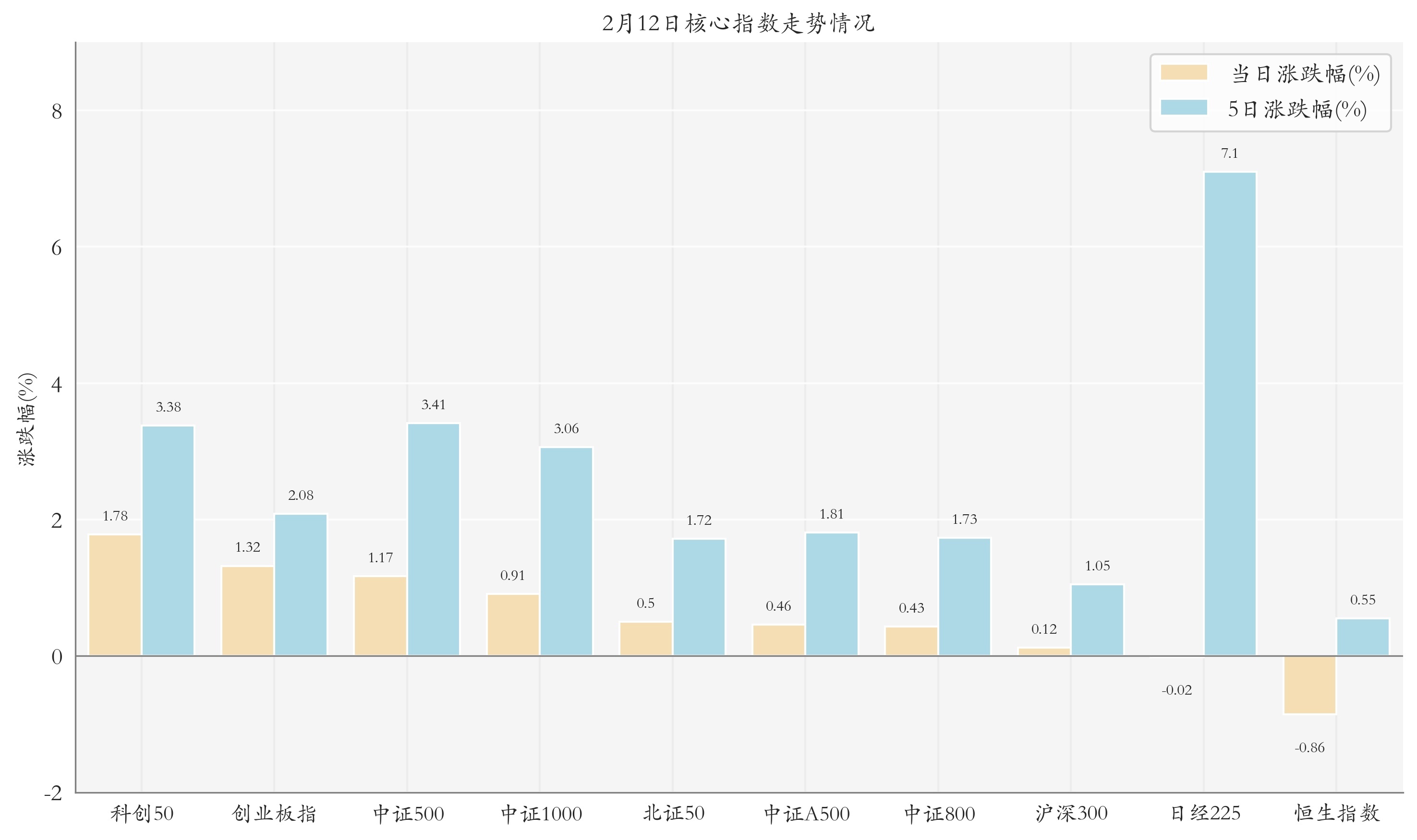统计A股与海外主要核心指数走势,今日(2月12日,下同)三大指数集体上涨,其中上证指数上涨0.05%,收于4134.02点,日内最高4140.59点;深证成指上涨0.86%,收于14283.0点,日内最高14296.48点;创业板指上涨1.32%,收于3328.06点,日内最高3334.35点。今日科创50、创业板指与中证500走势排名靠前,日涨跌幅分别为1.78%、1.32%与1.17%;近5个交易日日经225、中证500与科创50的走势排名靠前,近5日涨跌幅分别为7.1%、3.41%与3.38%。