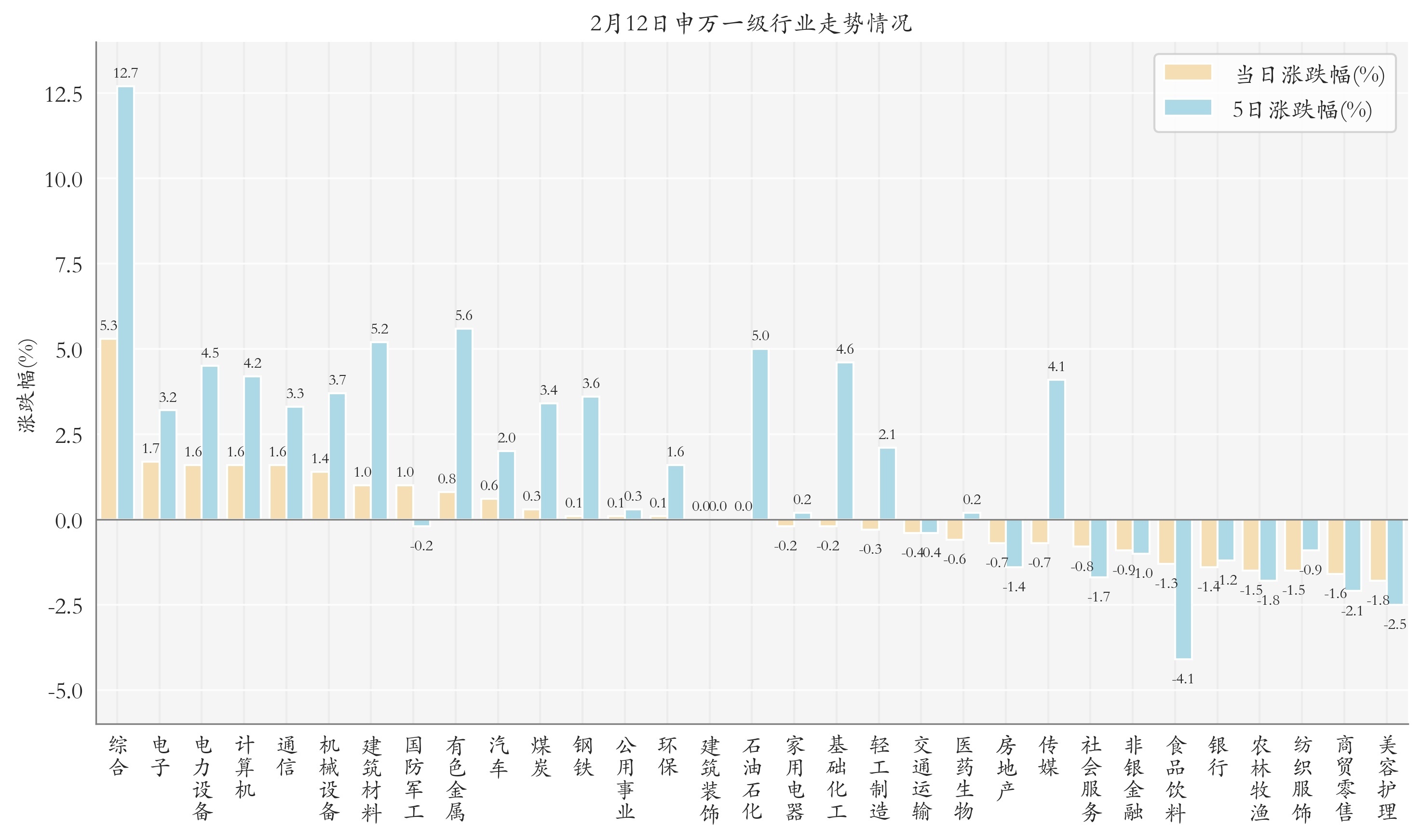 统计今日全部申万一级行业涨跌幅情况,综合、电子与电力设备今日走势排名靠前,日涨跌幅分别为5.31%、1.73%与1.65%,美容护理、商贸零售与纺织服饰的走势排名靠后,日涨跌幅分别是-1.77%、-1.57%与-1.49%;近5个交易日综合、有色金属与建筑材料的走势排名靠前,近5日涨跌幅分别为12.68%、5.55%与5.2%,食品饮料、美容护理与商贸零售的走势排名靠后,近5日涨跌幅分别为-4.14%、-2.53%与-2.09%。