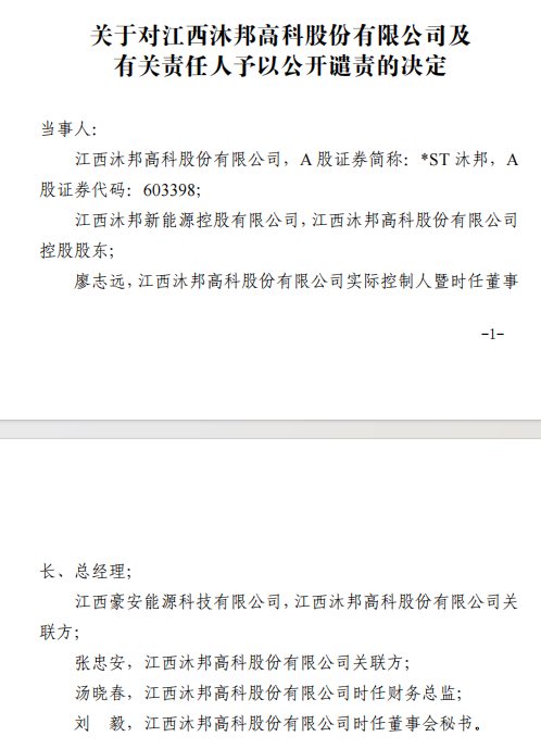 经查明,*ST沐邦及其控股股东江西沐邦新能源控股有限公司(以下简称沐邦控股),时任董事长、总经理廖志远,关联方江西豪安能源科技有限公司、张忠安在信息披露、规范运作方面,有关责任人在职责履行方面存在多项违规行为。