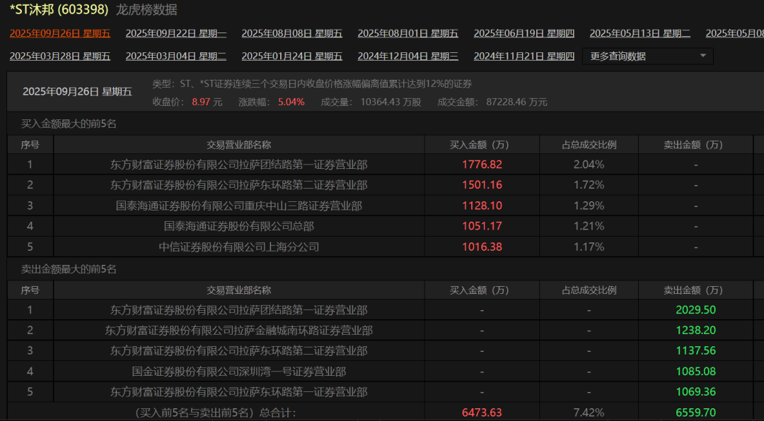 9月26日,*ST沐邦登上龙虎榜,前五大买方和卖方均出现游资频繁出没的营业部,包含东财拉萨团结路第一证券营业部、东财拉萨东环路第二证券营业部、东财拉萨金融城南环路证券营业部等。