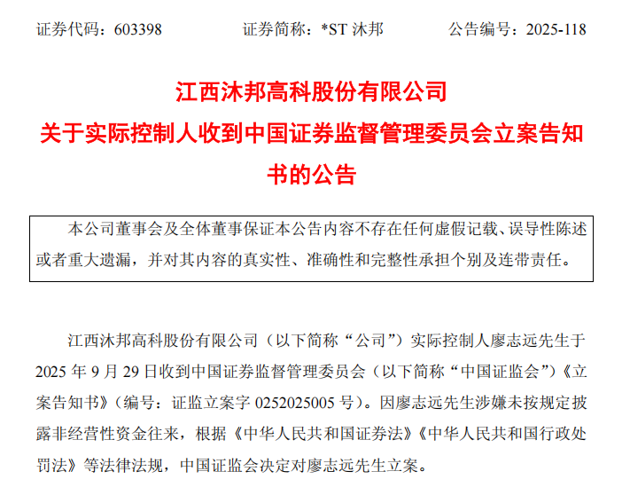 9月29日晚间,*ST沐邦(603398)发布公告,中国证监会决定对公司实控人廖志远立案,其涉嫌未按规定披露非经营性资金往来。