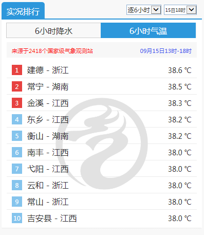 昨天(9月15日),除了沿海和浙北北部个别站点外,绝大部分地区的最高气温都越过了高温线,最高的建德达到了38.6℃,又为浙江拿到了全国第一的“殊荣”。