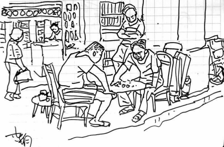 我有时也住在骑楼里,所以我说的就是我看见的。我已经很久不画这样的写生,我现在画的是我对广州骑楼的综合印象:无论如何,它不应该成为一个空的走廊;如果绘画本身也需要出现“点景人物”,那就让人们在这里下棋吧,看到的人一定会觉得似曾相见。